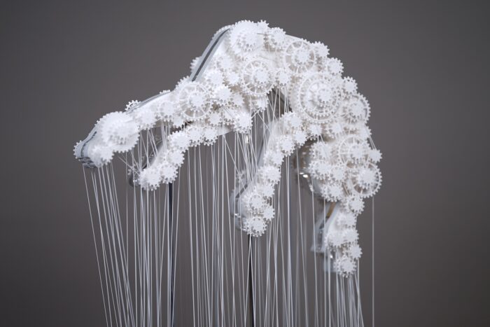 誰にとっても身近な紙という素材を用いて作品を制作する伊藤。特別な道具は用いず、真っ白な紙を切ったり折り曲げたりしながら、まるで細胞が増殖していくかのように作品を生み出します。幾何学的であると同時にどこか有機的な造形、そしてその美しい陰影は、シンプルな白い紙だからこそ見えてくるものです。ストイックで繊細な作業に裏打ちされた作品からは、「ただの白い紙」に無限の可能性があることを感じさせます。
