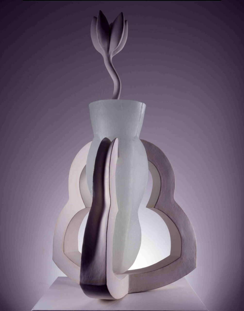 In the 1980s, Tashima came to prominence as one of the “cho-shojo” (“Ultra Girls”), a generation of women artists celebrated for bold, uninhibited work that defied existing art-world conventions. Her early work was charged with vivid primary colors and forms that evoked female physicality, and its raw energy commanded immediate attention. Around 1988, organic forms suggestive of plant life entered her work, and her focus shifted toward shape, texture, and the quality of the surrounding space. By around 1992, she had arrived at an austere palette of white slip alone, and her work took on a quiet, contemplative character. She went on to combine mold-cast translucent glass with ceramic, arriving at a mature practice in which refined pliancy and underlying strength coexist.