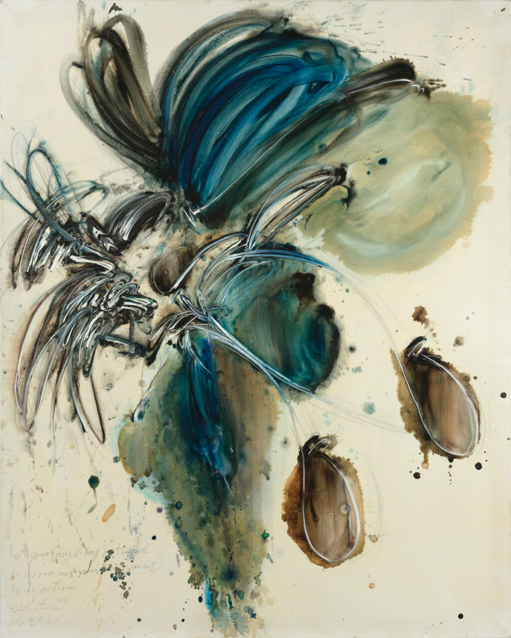 Working with bold strokes and rapid brushwork, Tachi translated his inner imagery into biomorphic abstract forms. His family were professional beekeepers, and as a child he traveled with them around Japan as they followed the flowers through the seasons, growing up immersed in the natural world and attuned to its shifts, from the turning of the seasons to the changing light of morning and evening. These formative experiences became a vital wellspring for his art and led him to produce works depicting insects. In 1994, he was selected for “VOCA: The Vision of Contemporary Art” at The Ueno Royal Museum, where he received an Encouragement Award. He also showed work in a number of museum exhibitions, including Hara Documents 5 at Hara Museum of Contemporary Art in 1998 and a solo exhibition at Mie Prefectural Art Museum in 2001. He continued making art until December 2008, and his work never stopped evolving, growing in depth and intensity to the very end.